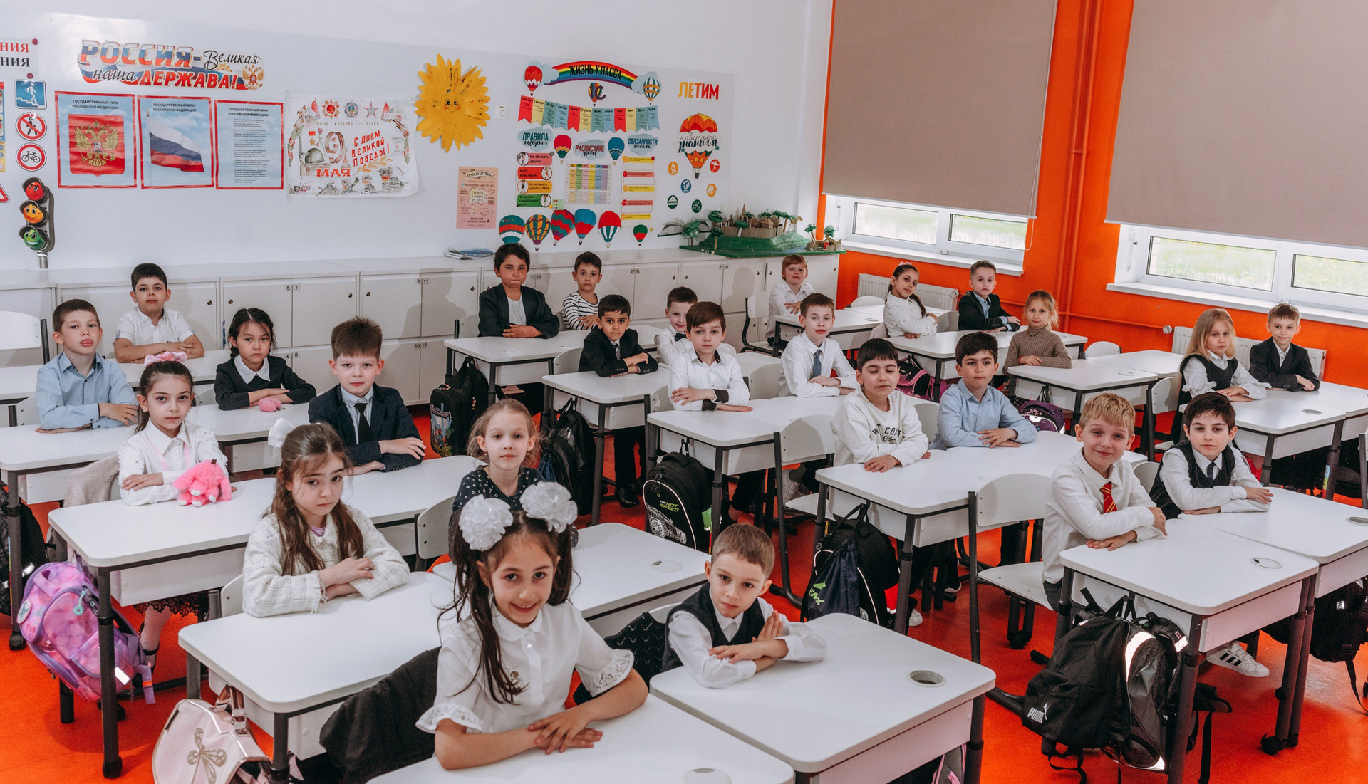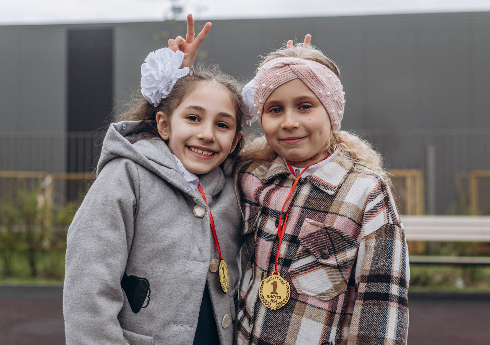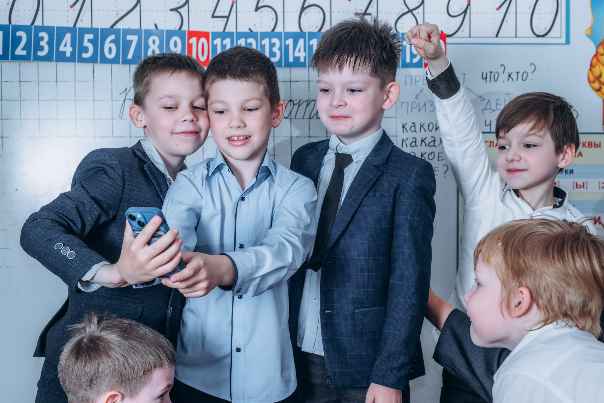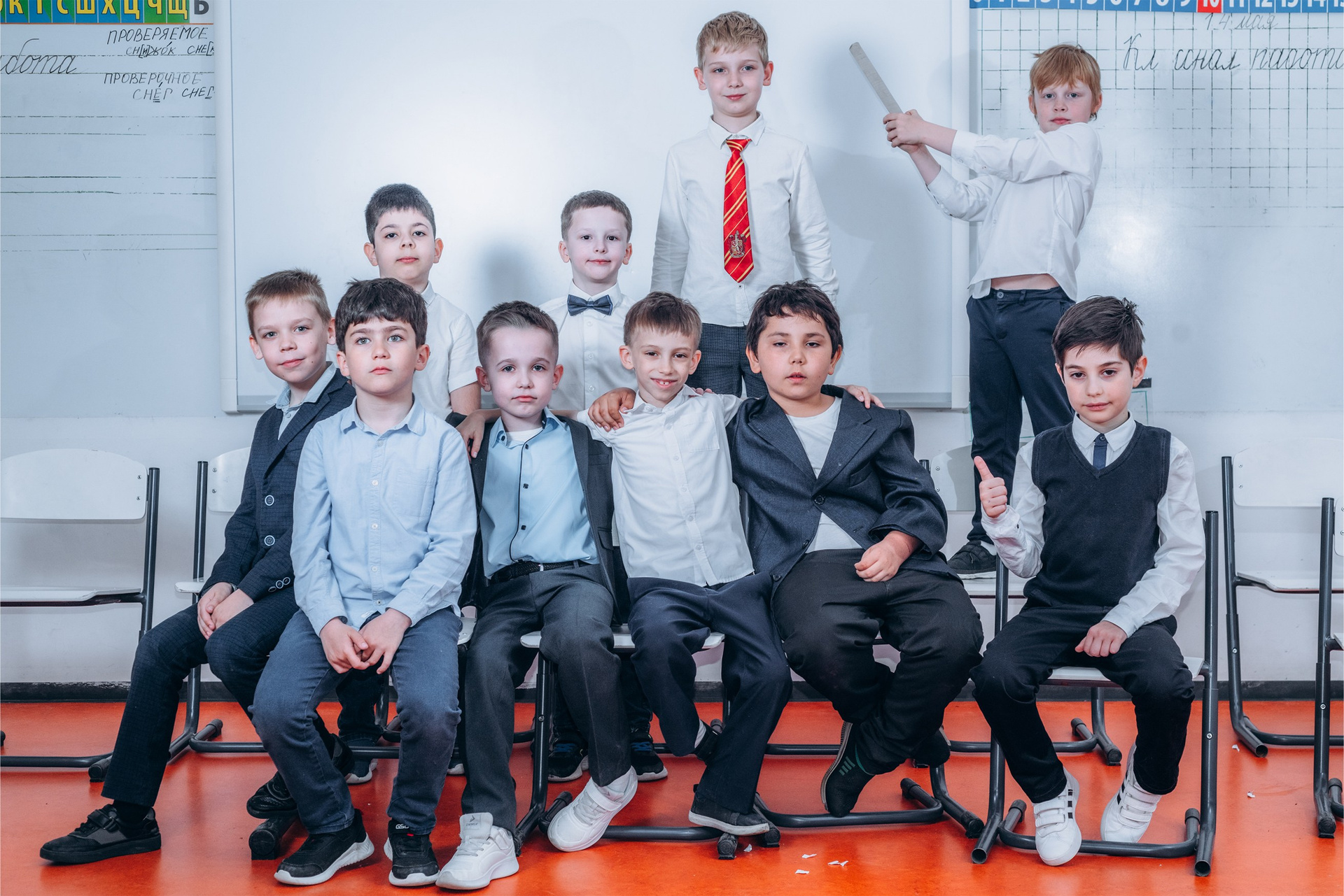 Делали два формата. В классе — уютный круг у доски, с любимой учительницей. На улице — на детской площадке, как память о первом учебном годе.